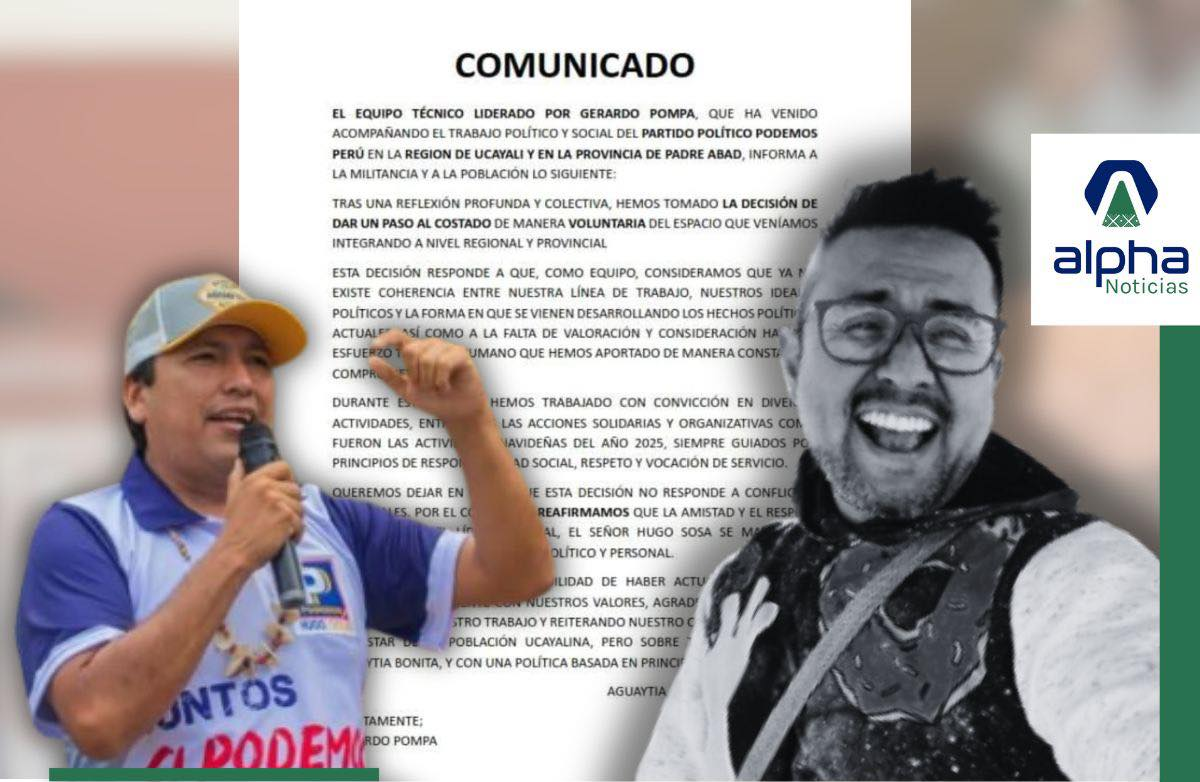 A través de un comunicado público, el equipo técnico liderado por Gerardo Pompa anunció su decisión de dar un paso al costado del espacio político regional y provincial que venían integrando en Ucayali y Padre Abad. El pronunciamiento, difundido desde Aguaytía, señala que la decisión fue tomada tras una “reflexión profunda y colectiva”, argumentando que ya no existe coherencia entre su línea de trabajo, sus ideales políticos y la forma en que se vienen desarrollando los hechos actuales.