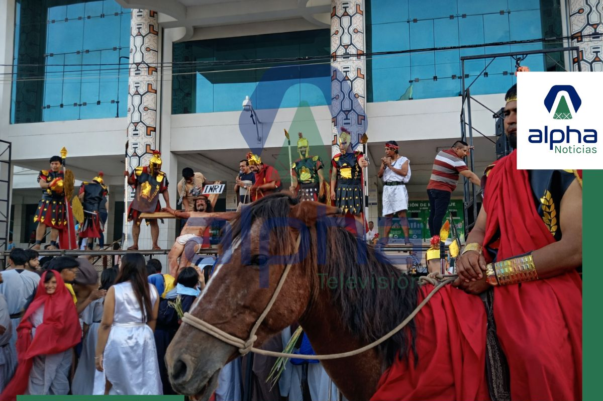 Este viernes 3 de abril, en el marco de las celebraciones por Semana Santa, se llevó a cabo una impactante escenificación de la crucifixión de Jesús en la Plaza Mayor de Pucallpa, congregando a una gran cantidad de fieles y público en general.